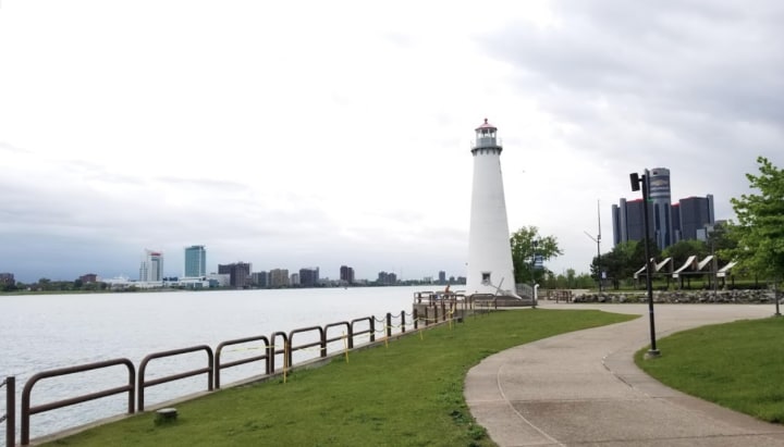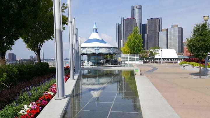 The Detroit Riverwalk is located in downtown Detroit, Michigan offering great views of not only the city but neighboring Windsor, Ontario. It stretches along the Detroit River from the Joe Louis Arena to Gabriel Richard Park.
