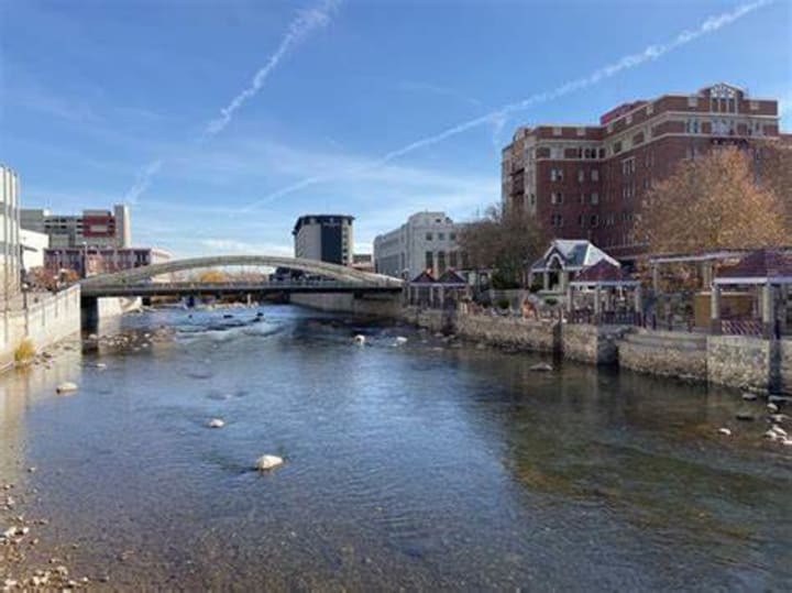 The Riverwalk District in Reno, Nevada along the Truckee River is always bustling with activity. There are shops, cafes, bars, and outdoor entertainment. This stretch of river includes four parks, a collection of murals, and sculpture parks.