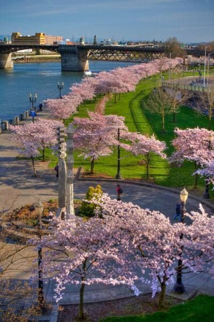 Governor Tom McCall Waterfront Park in Portland, Oregon stretches along the Willamette River. Walking here is a magical experience in the springtime when 100 Japanese cherry trees are blooming. It is the venue for the Waterfront Blues Festival and boasts the largest fireworks display in Oregon.