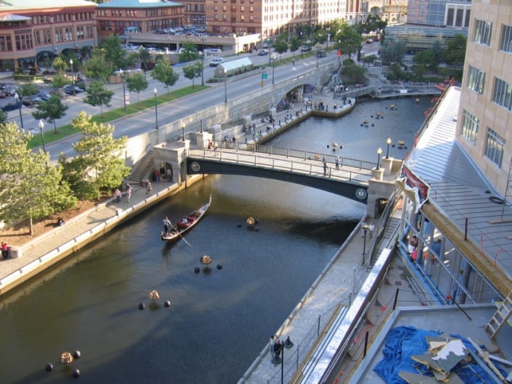 Waterplace Park and Riverwalk in downtown Providence, Rhode Island is located along the Woonasquatucket River. Here you can find historic landmarks, shops, and restaurants.