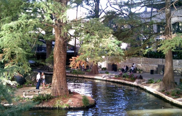 The San Antonio River Walk in San Antonio, Texas lies along the San Antonio River. This is a beautiful riverwalk that winds under bridges with two-parallel sidewalks lined with shops and restaurants.