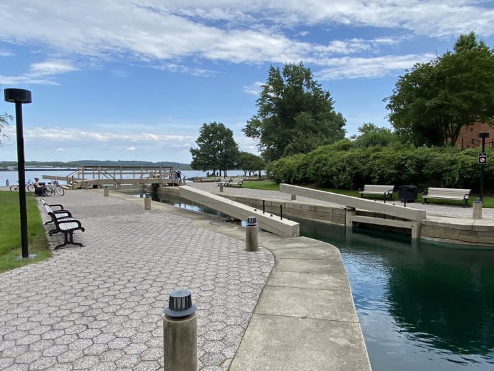 The Potomac River Waterfront Park stretches along the Potomac River in Alexandria, Virginia. Of interest are Tide Lock Park and neo-Classical sculptures.