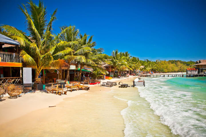 Koh Rong Samloem is one of the most beautiful islands. The Saracen Bay is home to a dozen beach hut resorts.