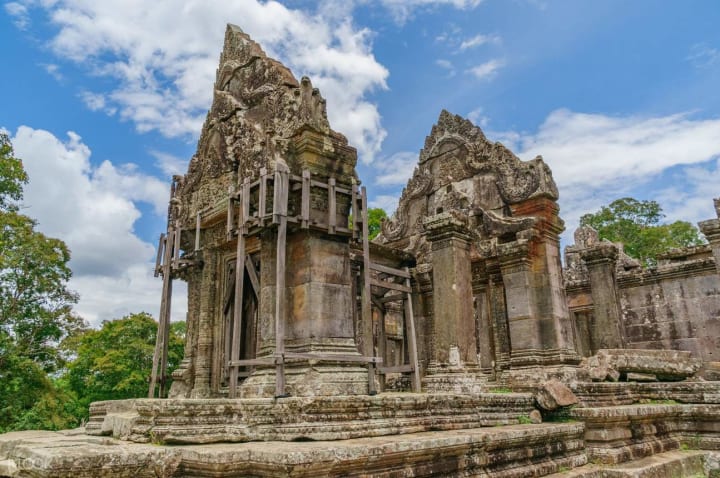 Preah Vihear Temple is located in the most dramatic location. It sits on top of the Dangrek Mountains. This is a complex of pavilions linked by long causeways and was originally built to honor the god Shiva. The temple is on the border with Thailand and is a UNESCO World Heritage site.