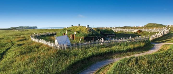 L'Anse aux Meadows National Historic Site is a green plain with moorland at the northern tip of the Great Northern Peninsula. This historic site was once a Viking settlement. There is a reconstructed long house, a workshop, and a stable. Costumed interpreters demonstrate life as it was in days past.
