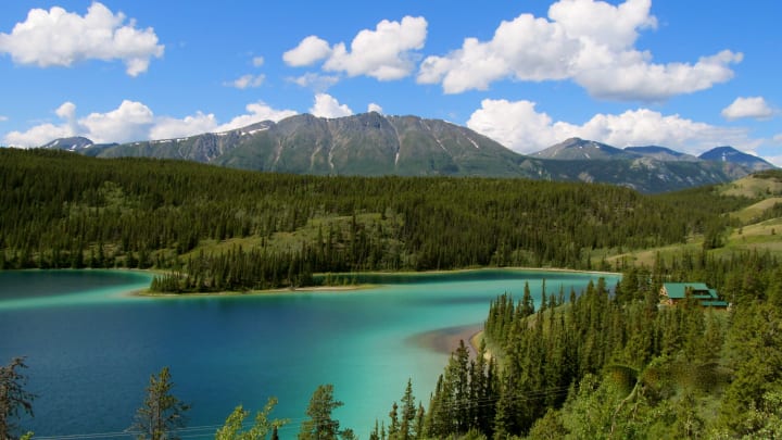 Emerald Lake is a lovely place and is one of the most photographed destinations in the Yukon. 14,000 years ago glaciers carved out Emerald Lake with dramatic mountain backgrounds. You can enjoy the scenery driving along the South Klondike highway.