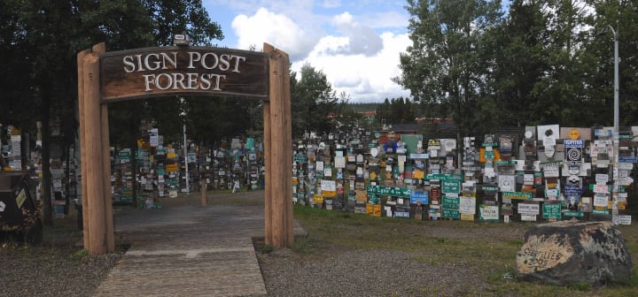 Sign Post Forest is located in Watson Lake, Yukon Territory. Here you can see signs brought by visitors from all over the world. It all began when a US soldier was repairing signposts along the Alaska Highway in 1942. He added on with the direction and mileage to his hometown in Illinois. Today there are more than 77,000 signs at this place. You can make your own at the Visitor Information Center.
