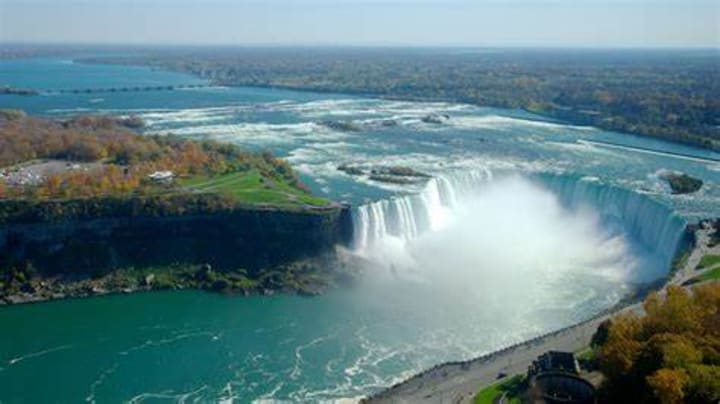 Niagara Falls is right on the border between Canada and the US. There are three falls the largest being Horseshoe Falls stretching between Niagara Falls, Canada, and Niagara Falls, New York in the US. The falls are located in the city of Niagara Falls and you can find many tourist attractions along the main strip.