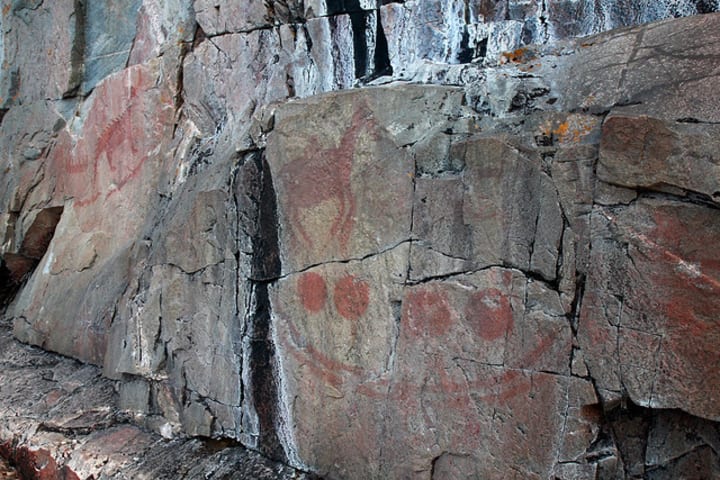 There are petroglyphs lining the cliff walls on the shoreline of Lake Superior at Lake Superior Provincial Park.