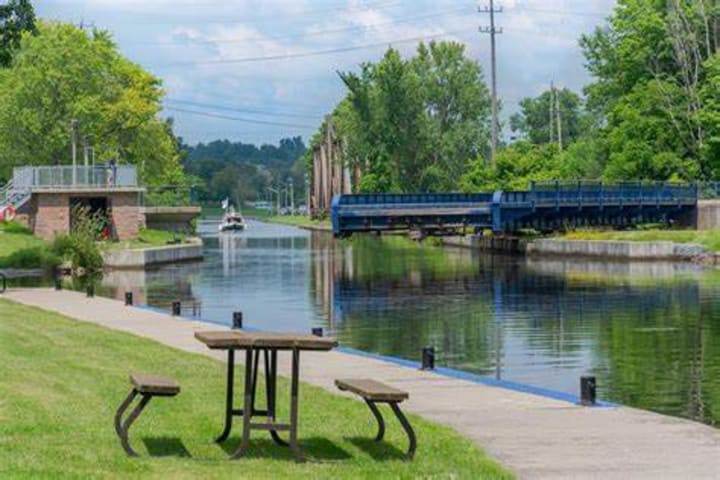 The historic Trent-Severn Canal was built in the late 1800s to early 1900s. It is a system of waterways that link Lake Ontario with Georgian Bay on Lake Huron. The canal makes its way through rivers and lakes like the Trent River and Lake Simcoe east of Ontario.