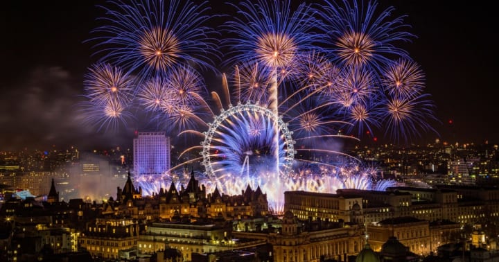 The New Year is welcomed in the capital, London by the chimes of Big Ben. The clock strikes thirteen times as the New Year comes at midnight. London celebrations are broadcast by the BBC and fireworks are set off above the London Eye.