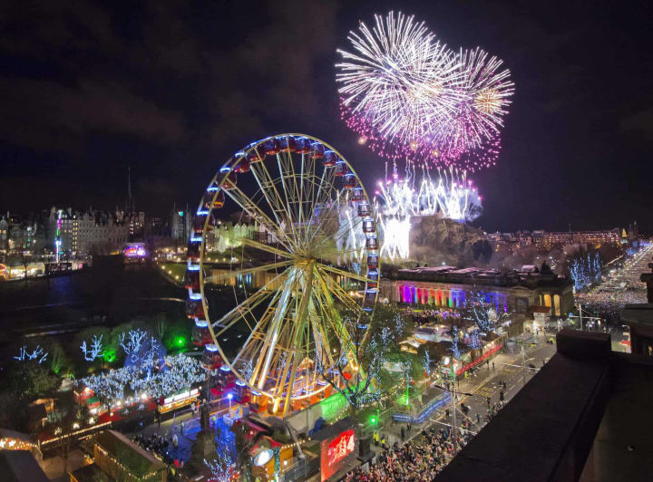 In Scotland, the New Year is known as Hogmanay. It is celebrated with customs like First Footing. This is when family members or friends visit each other bringing gifts of whiskey or at times a lump of coal. In Edinburgh, the capital one of the most famous New Year's Eve celebrations in the world occurs with a street party all along Princes Street. When midnight strikes at Edinburgh Castle a cannon is fired, and fireworks light up the sky. Starting from December 28th until New Year's Day or January 2nd BBC Scotland broadcasts all the celebrations.
