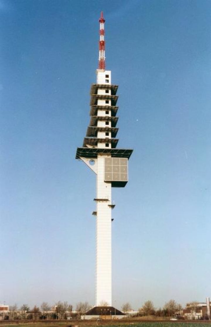 The Telemax Radio Tower get illuminated in rainbow shades when a major trade fair in taking place in the city. The broadcast tower is operated by Deutsche Telekom and is 282 meters high, including the 10 meter high base building. It was designed by Hans U. Boeckler and built from 1988 to 1992. It received the cement-steel prize Die Kunst des Bewehrens for the towers truss structure.