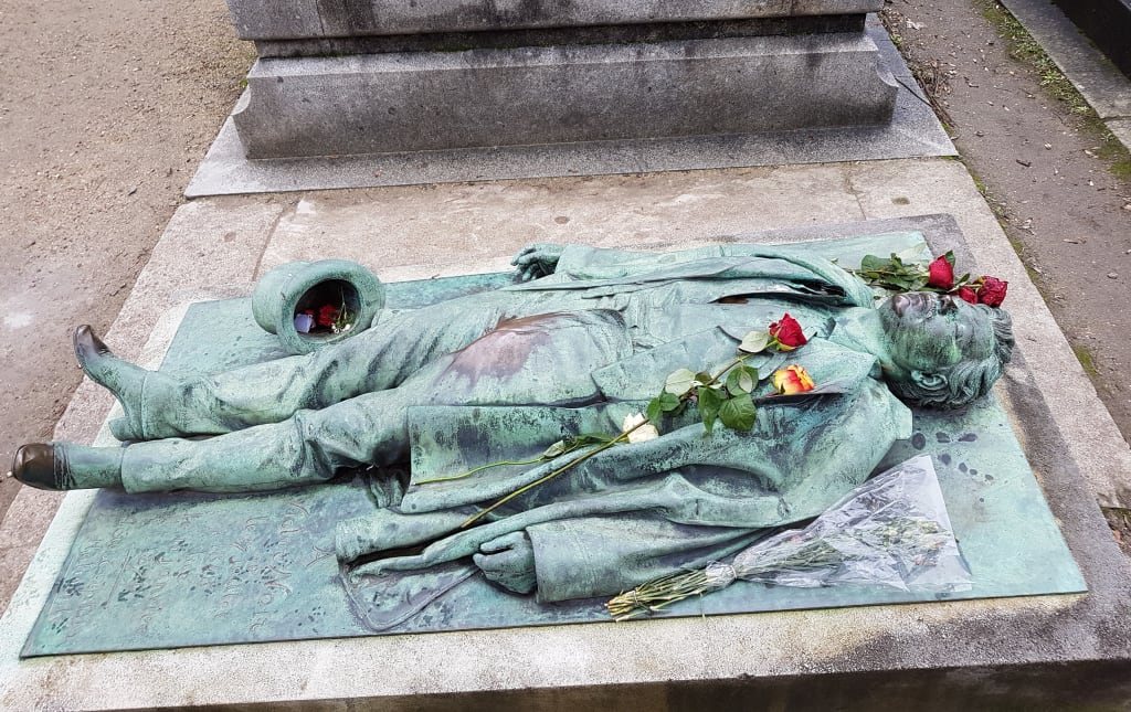 One of the most famous graves belongs to a man named Victor Noir who was a journalist of no great distinction up until the time of his death in January of 1870. Noir’s editor had just been challenged to a duel by Prince Pierre Bonaparte, great nephew of Napoleon Bonaparte and cousin to Emperor Napoleon III, Emperor of France at the time. The editor requested that Noir act as one of his seconds and in that role he should not only accept the challenge, but that he also make arrangements for the duel to take place. Accounts get a little hazy about this stage, but after arriving at the Prince’s home to make preparations, angry words were exchanged and Pierre Bonaparte drew a pistol and fired the fatal shot which killed Victor Noir.