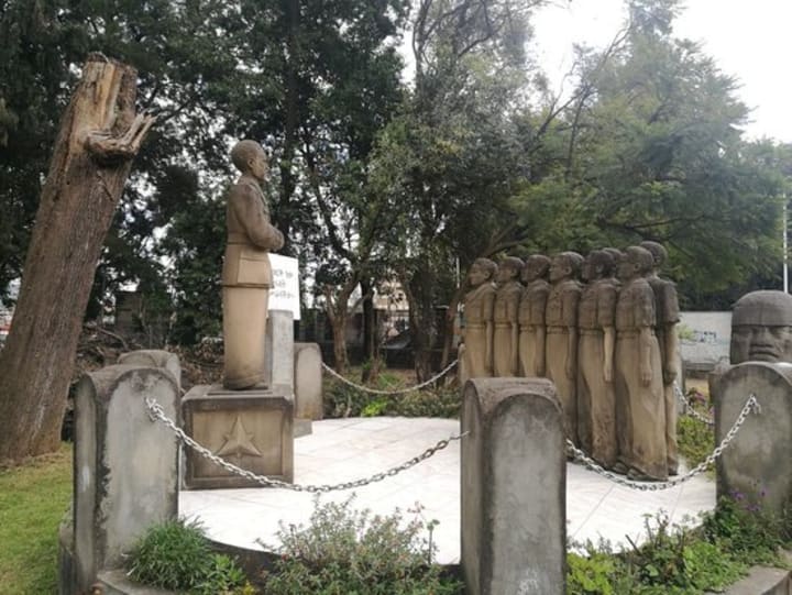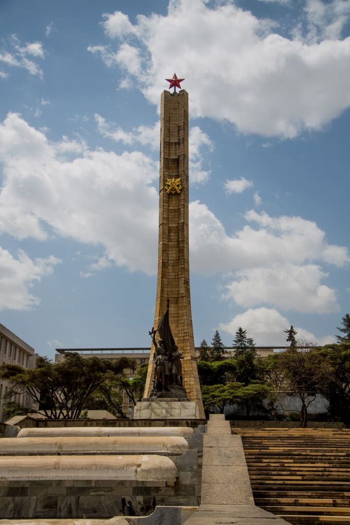 The Tiglachin Monument is a memorial to Ethiopian and Cuban soldiers who were involved in the Ogaden War. It was built under Mengistu Haile Mariam. It is sometimes erroneously referred to as the “Derg Monument” but the monument doesn’t honor the Derg regime. The monument consists of various elements – a central statue, a 50 m tall pillar, two wall reliefs on the sides and two squares where the portraits of Cuban soldiers are visible. The monument is located in front of the Black Lion Hospital.