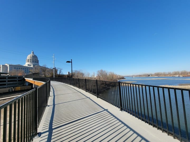 The Bicentennial Bridge is a 12-foot-wide pedestrian/bicycle bridge that connects the Missouri State Capitol Complex to the 30-acre parkland located north of the Union Pacific Railroad. The bridge spans the railroad and slopes down to Deborah Cooper Park on Adrian’s Island. Here people can enjoy the riverfront.