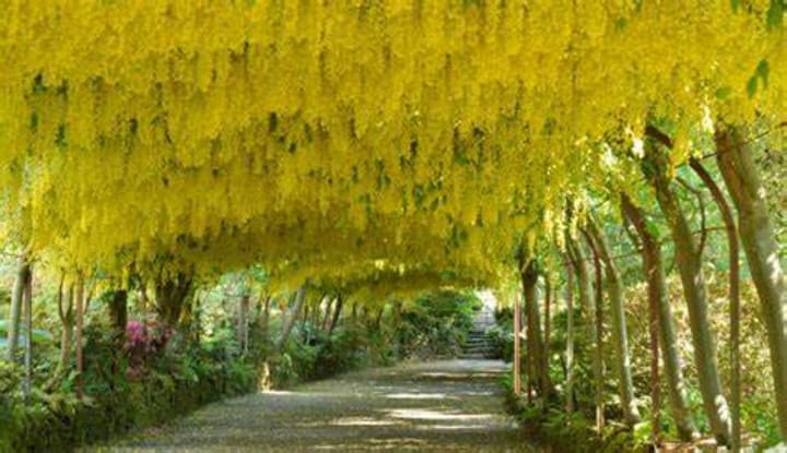 At the National Botanic Garden of Wales in Conwy, Wales you’ll find the amazing and beautiful Laburnum Arch. During the spring the golden flowers from the branches of the laburnum tree, create a tunnel of blossoming beauty. This archway is 180-feet-long and is said to be the longest in the UK. In the spring the flowers burst forth from the branches and drape down like pearls and have been nicknamed “Golden Rain.” To see this amazing happening you should visit the botanic garden in late May or early June.