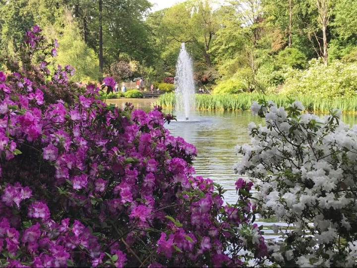 Crystal Springs Rhododendron Garden is located to Shakespearean Island in Portland, Oregon. The island is surrounded by the waters of Crystal Lake. Besides have many colorful rhododendrons it is also a wildlife refuge with ducks, geese, red-winged blackbirds, and scrub jays. The garden includes over 2,500 rhododendrons and other plants with fountains and winding trails.