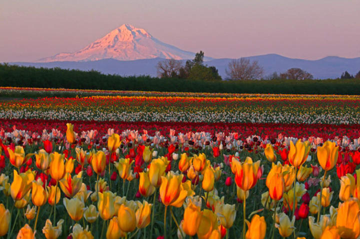 In the Willamette Valley in Woodburn Oregon you’ll find the Wooden Shoe Tulip Farm, This is one of the largest tulip farms in the Northwest of the US. The tulips bloom in many rainbow colors and there are around 80 varieties of tulips. Mount Hood makes an impressive background. There is an annual spring festival when the tulips bloom between late March and early May.