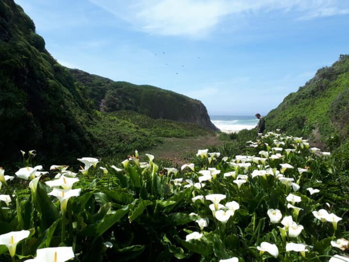 Calla Lilly Valley is located in Carmel-By-the-Sea in California. There are many lovely flowers in this little valley and a creek flowing into the ocean. You can follow the Garrapata Trail toward a bluff that overlooks the beach. Then down a few wooden steps into the valley and see the beauty of thousands of blooming white calla lilies.