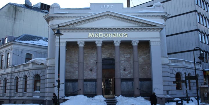 In Kristiansand, Norway you can find a McDonald’s in an old bank with giant marble columns. The original door is closed but the entrance to the restaurant is now on the side. This Mcdonald’s serves not only their usual food but also McLaks, freshly caught salmon sandwiches.