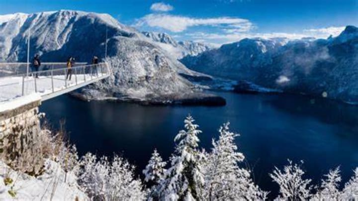 White blankets of snow make this village even more picturesque and you can take a stroll along the lake. All around are snow-capped mountain peaks, snow-covered trees, and nature.