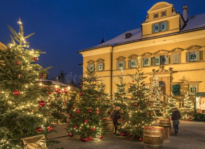 Hellbrunn Palace is adorned with sparkling lights and there is a carousel to ride.