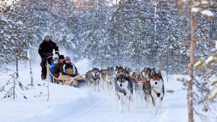 A memorable adventure is taking a husky sleigh ride. The huskies pull you through snow-covered trails for an unforgettable winter holiday adventure.