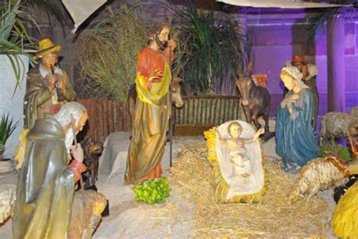 The iconic Strasbourg Cathedral is illuminated during the Christmas season and there is an elaborate nativity scene inside.
