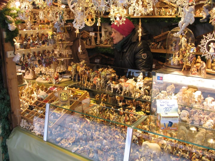Kripperlmarkt is devoted to creche scenes, their people, animals, and buildings, There are lovely hand-modeled figures and carved wooden figures from nearby Oberammergau and Alpine villages in Bavaria.