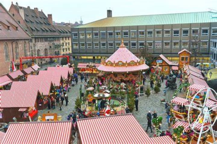 Christkindlemarkt in Nuremberg, Germany is the best-known Christmas market in Europe and first gained status as a major tourist attraction. The large square is surrounded by Medieval buildings highlighted by an illuminated cathedral. On one side is an illuminated fountain. The entire scene is filled with rows of cabins each with its own wonderland.