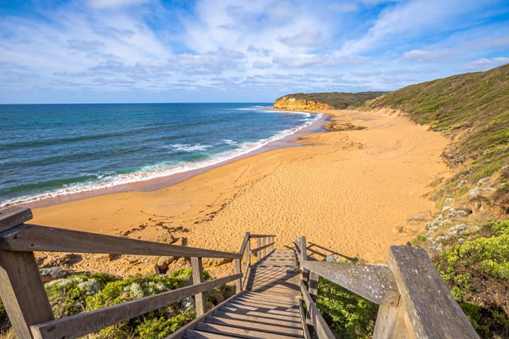From here visitors continue on to the Australian Heritage listed 243-km Great Ocean Road. There are lovely coastal and mountain views. The road stretches past charming towns like Apollo Bay as well as white-sand beaches.