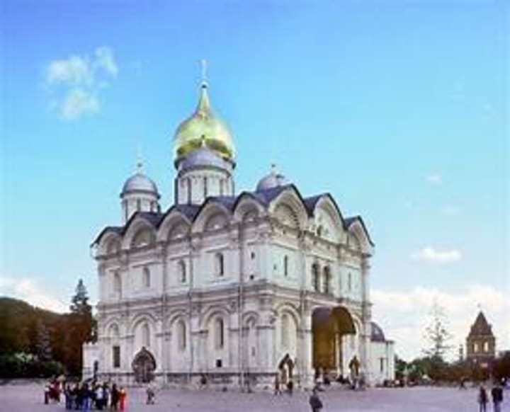 The Archangel Cathedral is located at the southeastern corner of Sobornaya ploshchad and for centuries was the place for the coronations, weddings and burials of tsars. It was built by Ivan Kalita in 1333 to commemorate the end of the great famine and was dedicated to Archangel Michael, the guardian of the Moscow princes. It was rebuilt by Italian architect Alevisio Novi between 1505 and 1508. It is in the Byzantine-Russian style and has five domes. The exterior also has many Venetian Renaissance features.