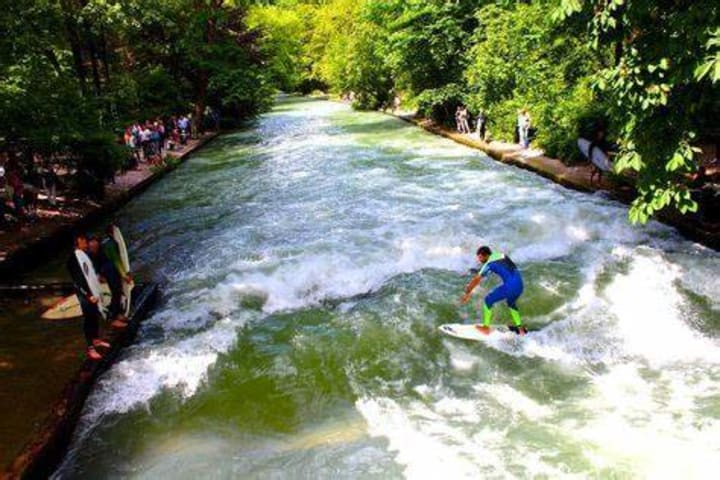 Eisbacwelle is the place to do the unusual in Munich – surfing. From beneath a small bridge water comes thundering out. Surfers line both sides of the bank, jump off the bank, and onto their surfboards. They tackle the waves year round.