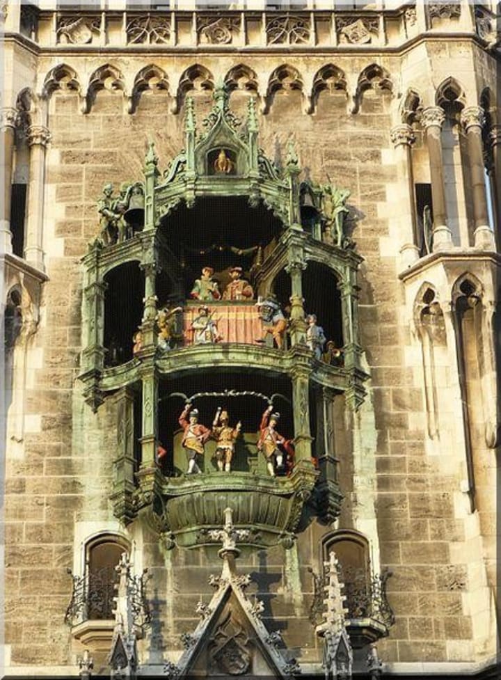 The carillon has 43 bells and 32 figures that perform two actual historic events. The top half tells the story of a knight's tournament held in 1568 to celebrate the marriage of Duke Wilhelm V to Renata of Lothringen, while the bottom half portrays the Schäfflertanz. If you want to see the show at eye level, head to the top floor of the Hugendubel bookstore or enjoy the Café Glockenspiel.