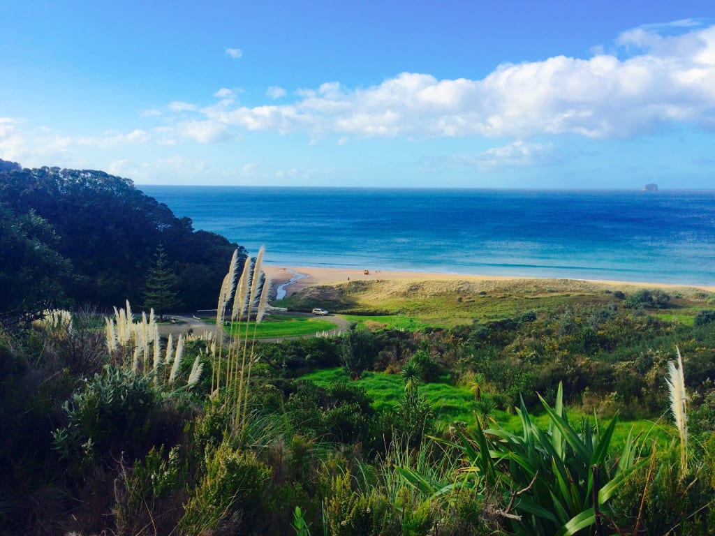 Bushes, fields and infinite greens to my left, obstacles of bushes and greens to the infinite layers of blue to my right. Between hitch hiking and hours of walking, Hot Water Beach was finally in sight.