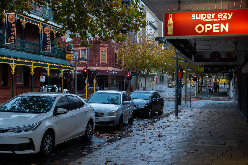 By day, an empty hub of Cafe's, Restaurants and Bars that can somehow afford to operate in the daytime. Urban Clothing boutiques that fall as quickly as they rise, The hustling vibe of the next door Techinical College TAFE that the uni kids mock but end up being more employable then them and with a quater of the debt. The state Library that only foreign students, immigrants and old people use as an actual library while the rest just use as a shortcut to the train station and to town. the road and pressed cobblestones that get harder as opposed to weaker over time and a long road of parked cars that people use erely as free parking because of option A; note enough parking in the middle of the city or B; too cheap to pay $4 hour parking.