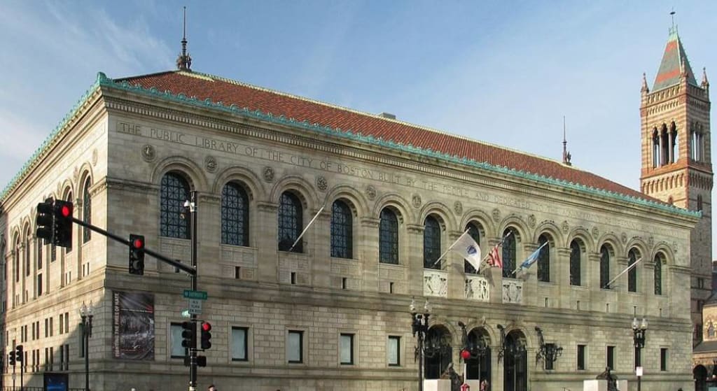 Eventually, he doubled back, taking a left on Purchase Street, and a right on Essex; walking until the road turned into Boylston Street. The trudge continued. Several blocks later, paying no time or attention to the stores around him, he reached the steps of the Boston Public Library.