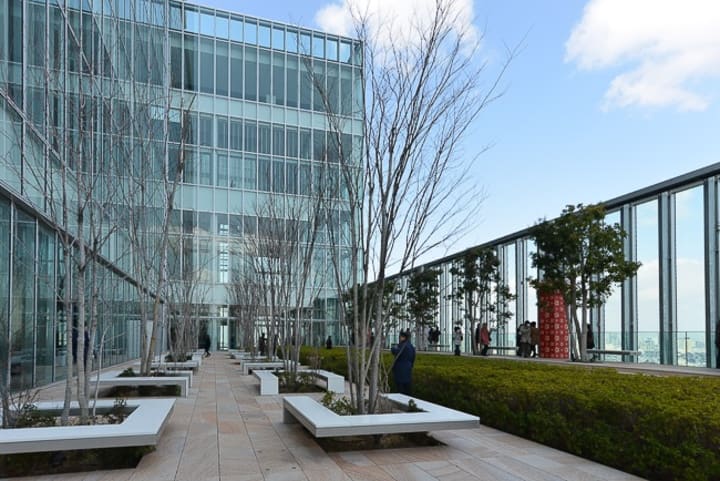 A rooftop plaza is located above the Abeno Harukas Kintetsu Department Store and has a small vegetable garden and a small shrine.