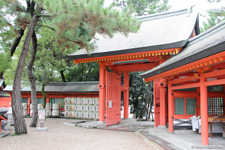 One of Japan’s oldest shrines is Sumiyoshi Taisha, founded in the 3rd century before the introduction of Buddhism. It displays an unusual style of shrine architecture known as Sumiyoshi-zukuri. This type of architecture is characterized by straight roofs, decorated by two sets of forked finials and five horizontal billets. These kinds of buildings have their entrance under the gable and are surrounded by a fence. There are four main halls with the first three positioned in a straight line facing west, while the fourth stands just beside the third.
