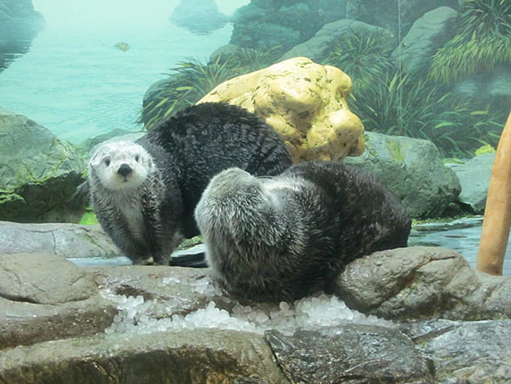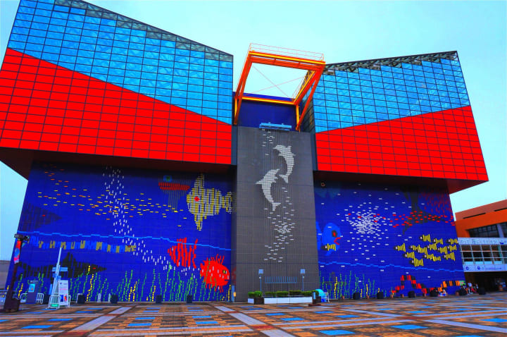 Visitors start their tour of the aquarium on the 8th floor and then spiral down floor by floor around the central tank. Some of the tanks stretch over several floors so it is possible to observe the animals from different depths. You can also see Antarctic penguins, coral-reef butterfly fish, Arctic otters, Monterey Bay seals, and jellyfish. The most impressive is the enormous central tank which is home to the whale shark, manta, and thousands of other fish and rays. There are good English descriptions and if you prefer you can get the audio guide.