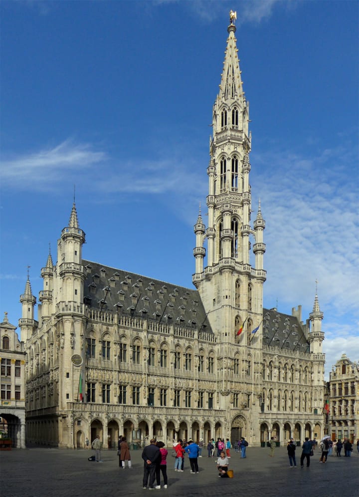 Grand Place in Brussels, Belgium is surrounded by impressive and intricately decorated buildings in various architectural styles.