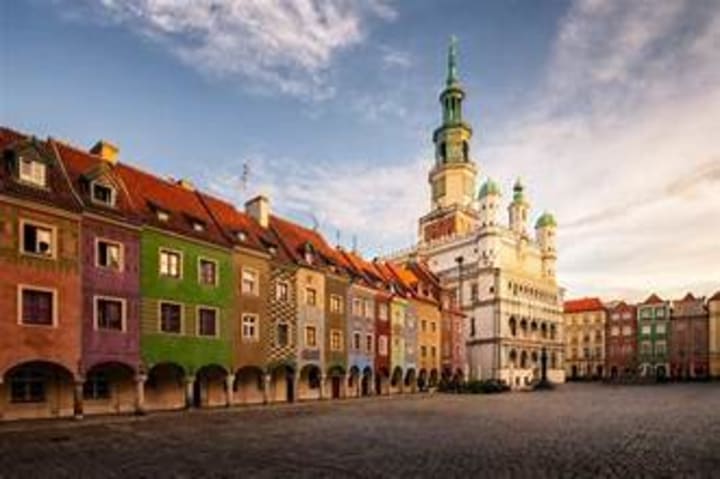 Located in Poznan, Poland it is quite a colorful place referred to as Old Market Square. There is the row of slender merchant houses in many colors.