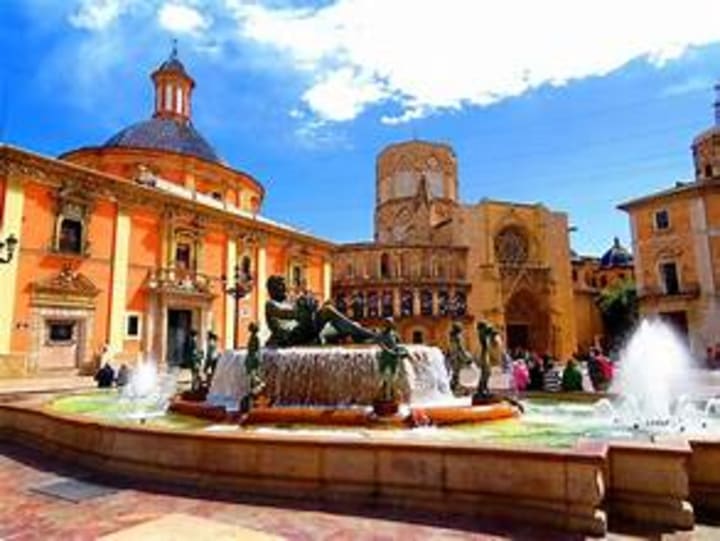 This plaza is located in Valencia, Spain. It is surrounded by impressive landmarks. In the center you'll find the lovely Fountain of Turia. Featuring a bronze statue of Neptune, the Roman god of sea and water.