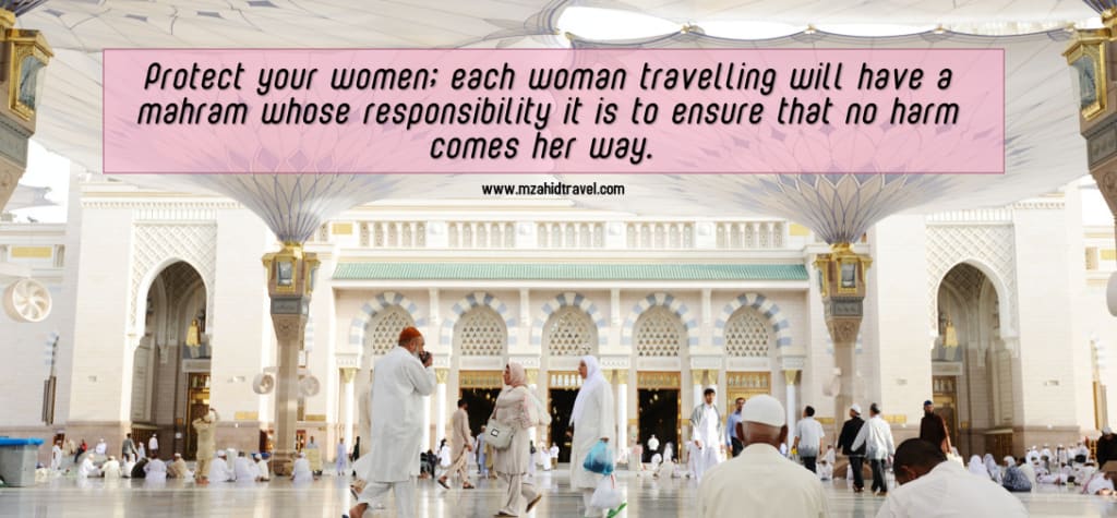 • Protect your women; each woman travelling will have a maHram whose responsibility it is to ensure that no harm comes her way. The worst men are the dayyooth (those who lack ghayrah, i.e. do not care if (non-maHram) men approach their wives, mothers, sisters or daughters) and the worst women are those that flirt.