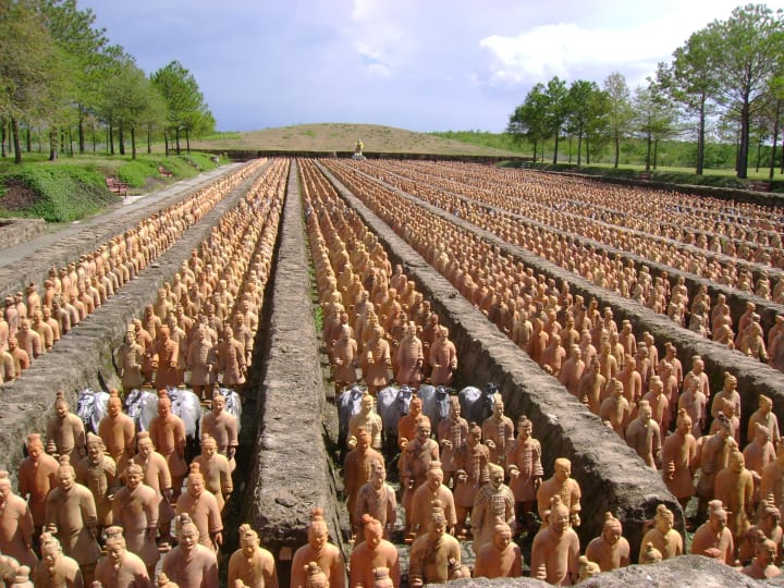 At the entrance to the Terra Cotta Army of Chin, the figures above were life-size and made from fiberglass. The others are the same type of clay as was found when the Terra Cotta Army was discovered. The original site boasts 10,000 Terra Cotta warriors.