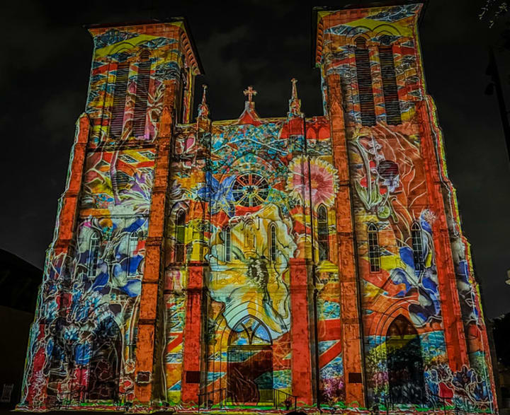 The cathedral is on the Main Plaza. At night it becomes the stage for one of San Antonio's most visually compelling attractions - San Antonio- The Saga. It is offered free of charge every Tuesday, Friday, Saturday, and Sunday evening. This video art installation is the creation of Xavier de Richemont. The 24-minute video along with choreographed music and narration is projected on the side of the San Fernando Cathedral. A 7,000 square-foot projection highlights the history and progression of San Antonio.