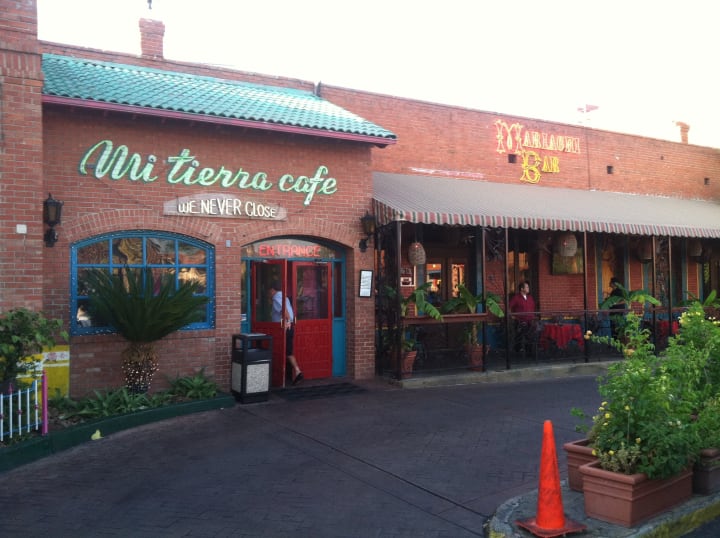 Take a look at Mi Tierra Cafe Y Panaderia offering lunch and dinner or a special treat from the bakery. This has been a San Antonio institution since 1941 and covers an entire block. It is open 24 hours serving Mexican food. The restaurant is decorated with Christmas lights and fiesta flags.