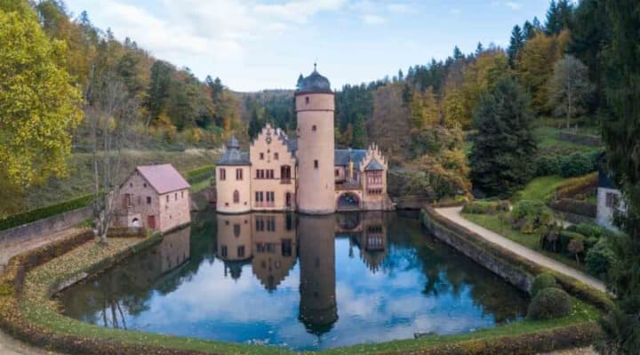 This castle started out as a simple house built on the water by an early 15th century knight. It is located in the Spessart Forest between Frankfurt and Wurzburg, Germany. This northern Bavarian castle is privately owned but visitors are invited to take tours. The castle is open to the public, with guided tours available that highlight its history and architecture. You can also stroll on the paths on the castle grounds.