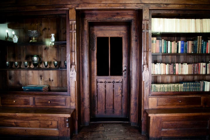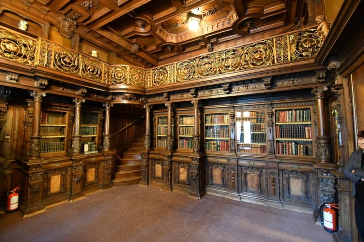 The library has rare books with leather covers, and there is a shelf that hides a secret door. Today it is home to a museum.